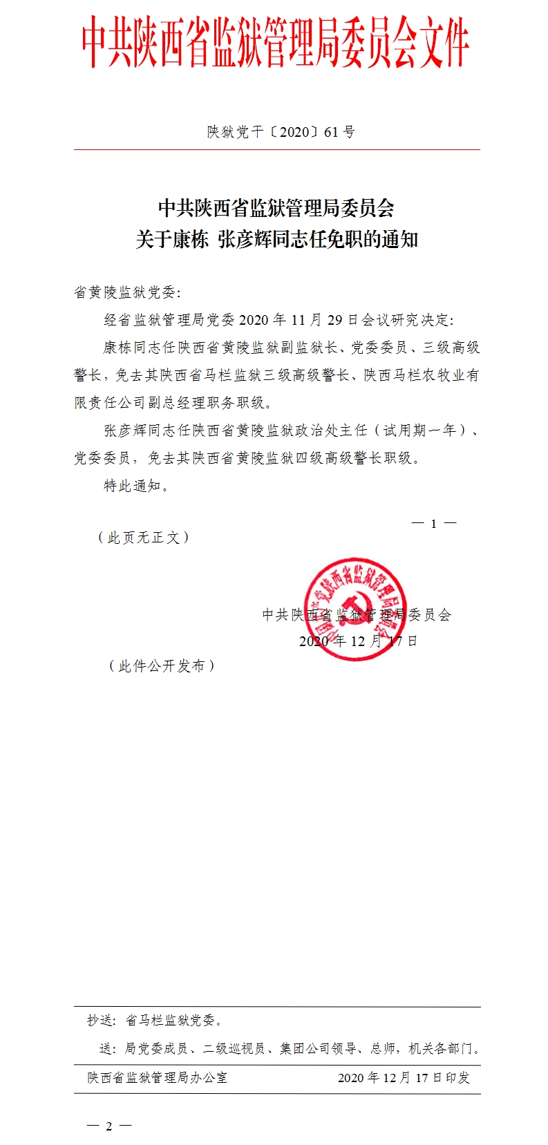中共陕西省监狱管理局委员会关于康栋 张彦辉同志任免职的通知