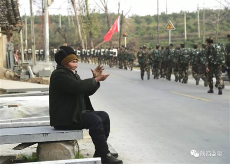 这是去年初春的一个早晨发生在汉中城边郊区的一幕。一队武警战士背着整齐背包,喊着响亮的口号,迈着统一的步伐向深山前进。旁边农家的一位老大爷也被声音吸引着走出了房门,当部队经过老大爷家门口时,老大爷突然鼓起掌来,眼里透露着希望和感激。